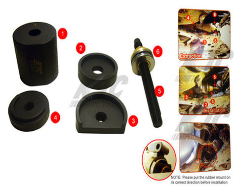 An application specific press tool designed to remove and replace the hydro-bushings on the front-axle lower control arms. Use of this tool allows the bushings to be serviced on the vehicle, thereby saving valuable time and effort.