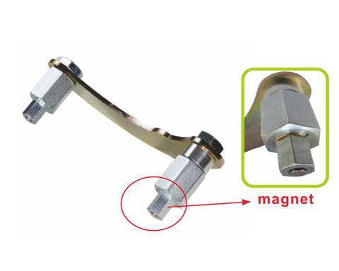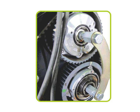 Camshaft alignment fixture designed specifically to align the camshafts of Subaru 2.0L and 2.5L DOHC turbo engines when performing timing belt, cylinder head or other front-engine service tasks. The tool locks the position of the left-hand camshafts to avoid catostrophic damage that can result from piston-to-valve contact when the timing belt is removed. Only one tool required.